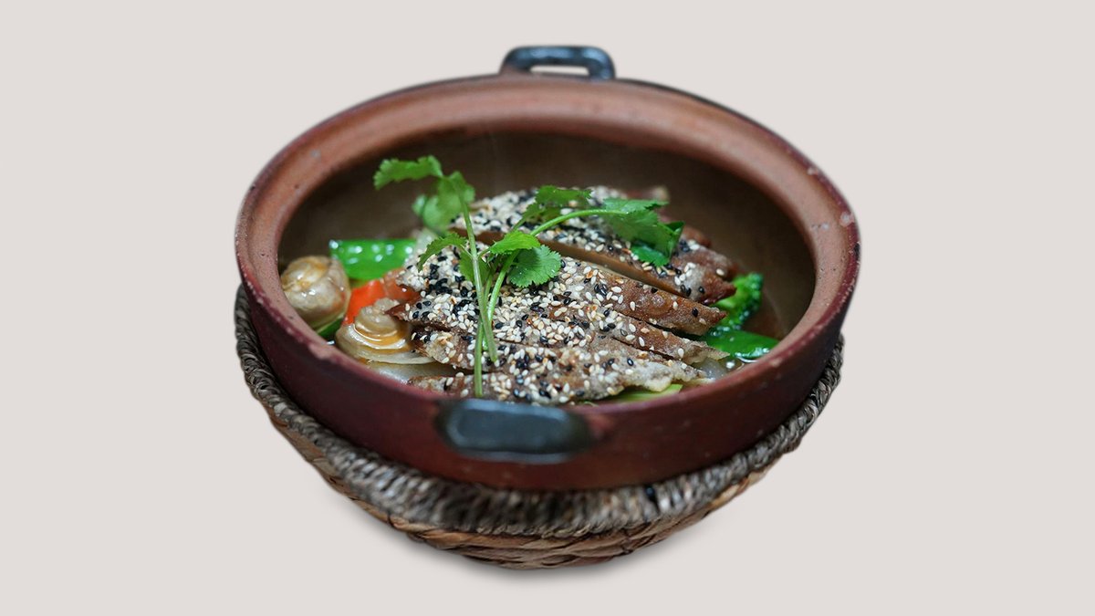 medium gegrilltes Barbarie-Entenfilet mit Betelblättern, Kaschunüssen, verschiedenem Gemüse und pikanter Soße im Steintopf
