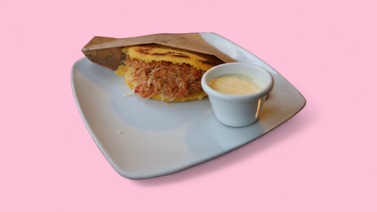 1 (one) Corn dough patty (Arepa) filled with pulled chicken cooked in onion, red bell peppers, tomatoes, and cheese. House sweet corn sauce on the side.