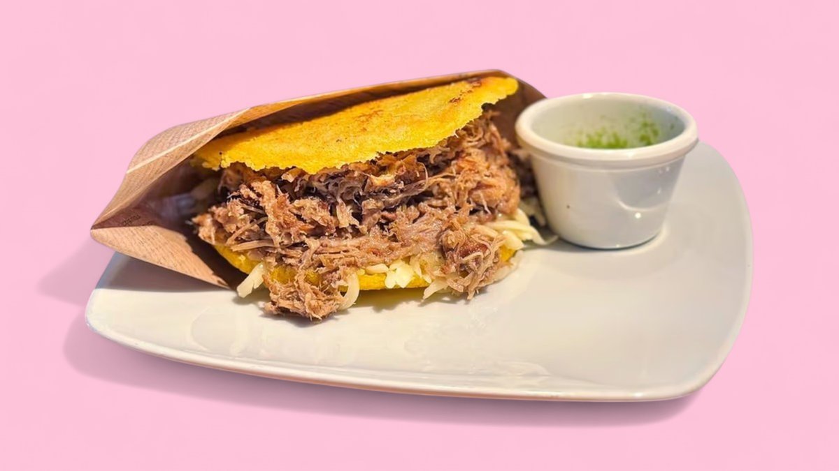 1 (one) Cron dough patty (arepa) filled with slow cooked crispy pork and cheese. Guasacaca (avocado, herbs, green bell pepper) sauce on the side