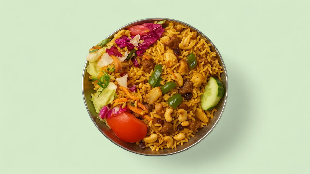 zartes gedünstetes Hähnchenfilet mit gebratenem Basmatireis, garniert mit Nüssen und Rosinen
