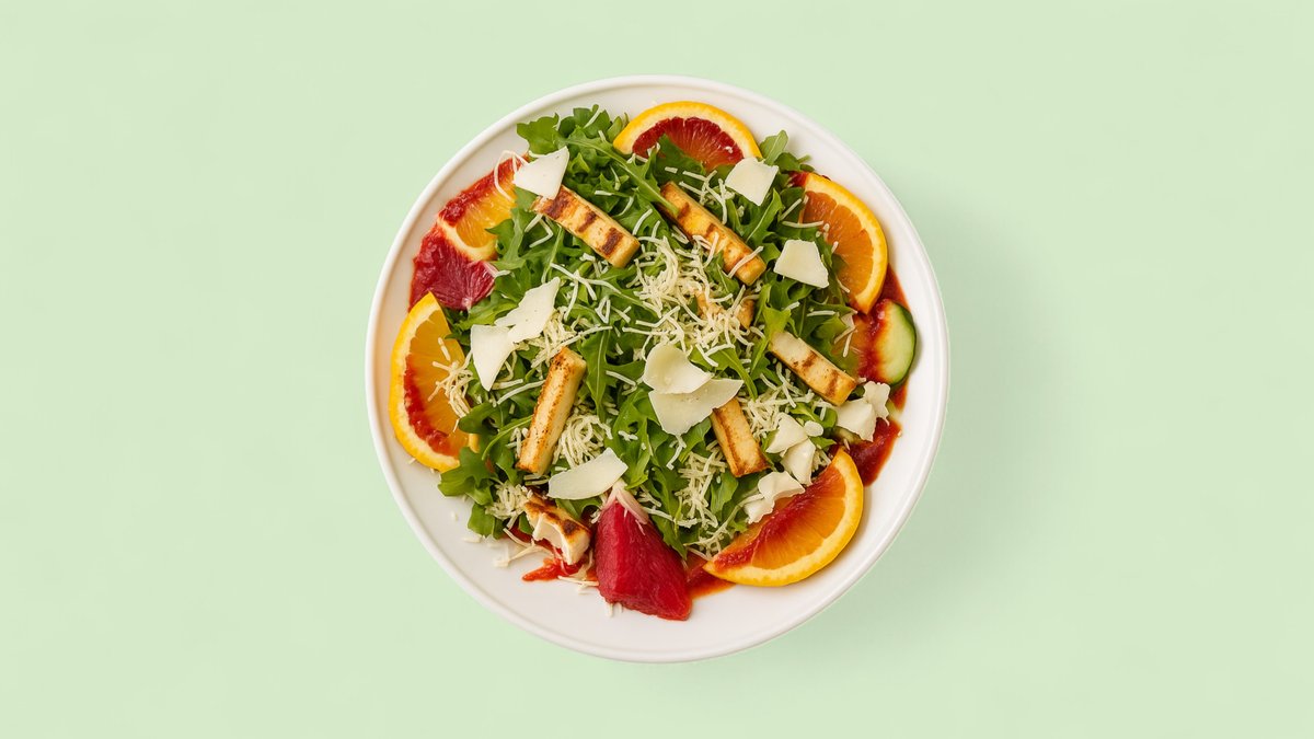 großer indischer Salat mit gegrilltem hausgemachtem Rahmkäse und exotischen Früchten
