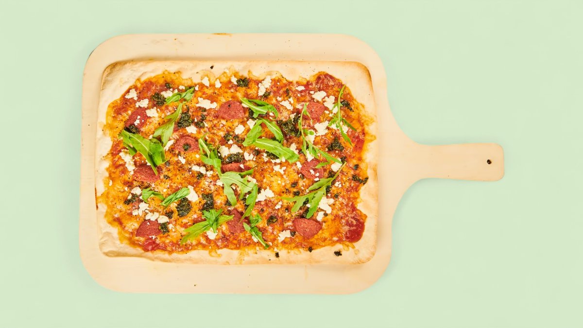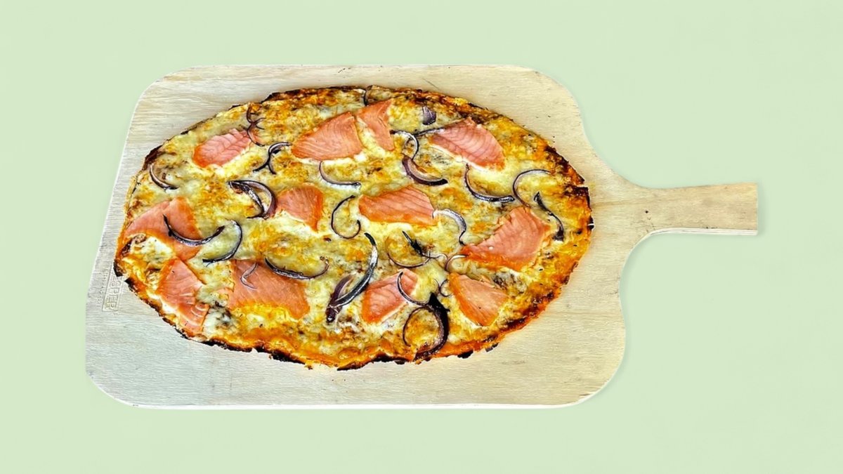 Tomatensoße, Käse, Räucherlachs, rote Zwiebeln, Rucola