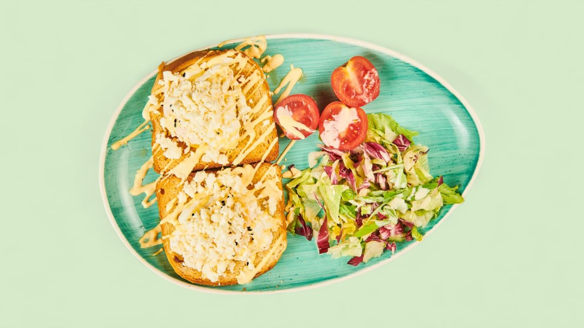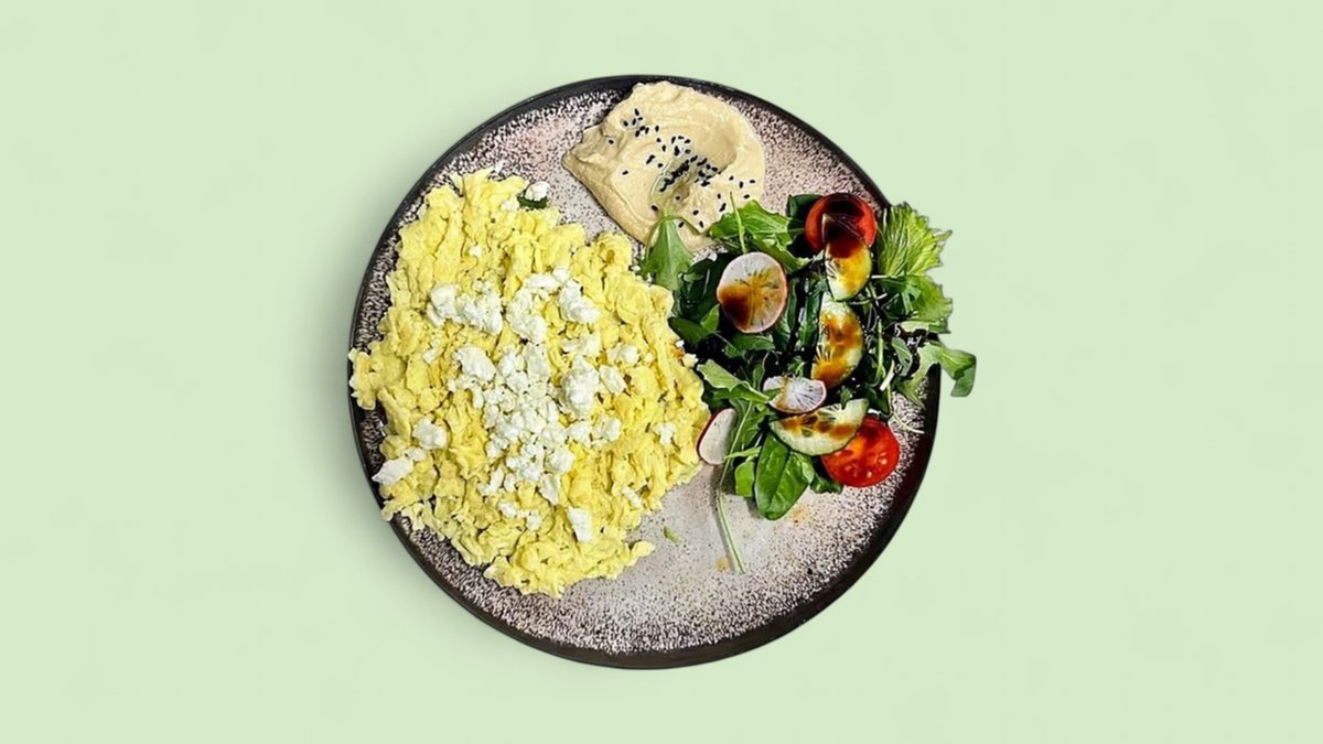 mit 3 Eiern (Höchste Qualität), Schafskäse, Briochetoast Hummus, Salat und hausgemachter Pesto