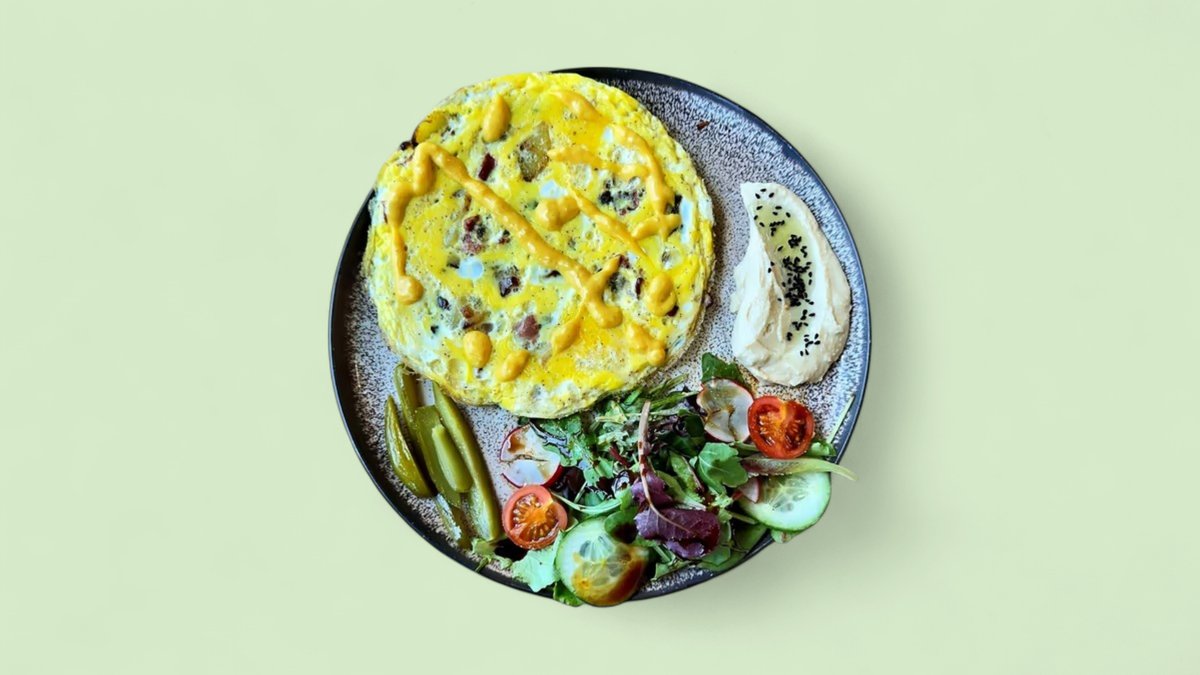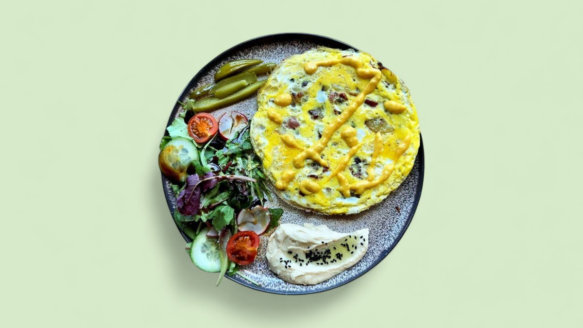 Omelett mit drei Eiern (Höchste Qualität), Kartoffeln, Rinderbacon, Zwiebeln, sauren Gurken, Hummus,Salat, Joppiesoße und Sauerteig Brot