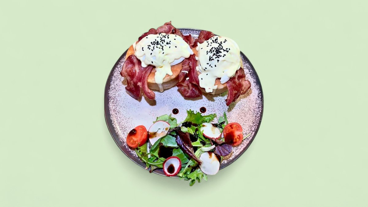 2 pochierte Eier (Höchste Qualität) ,auf Brioche Brot,3 Rinderbacon ,Salat und Sauce hollandaise