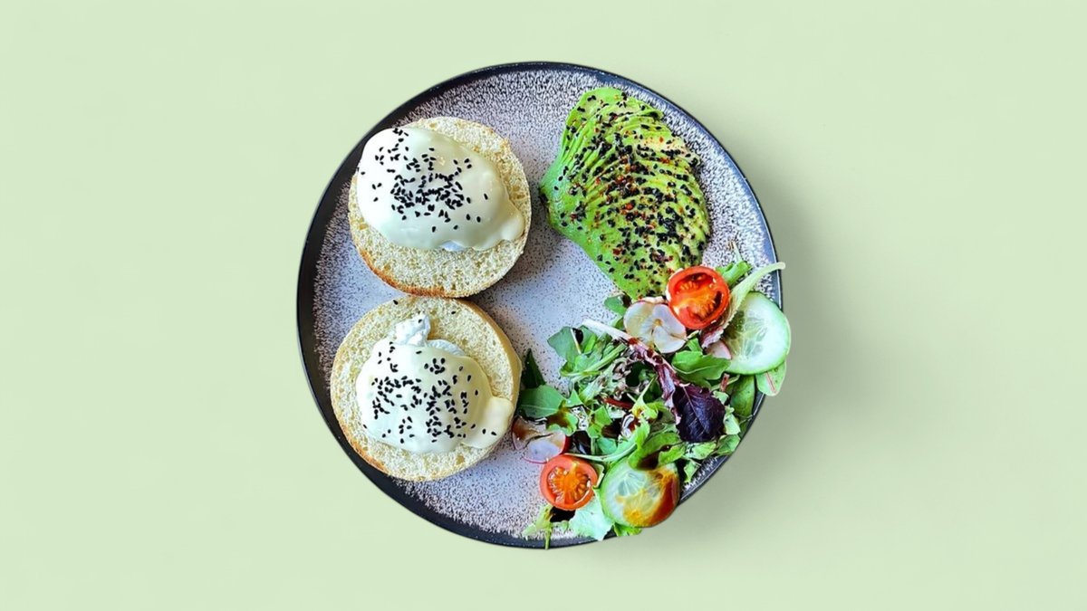 2 pochierte Eier (Höchste Qualität), auf Brioche Brot,Avocado ,Salat und Sauce hollandaise