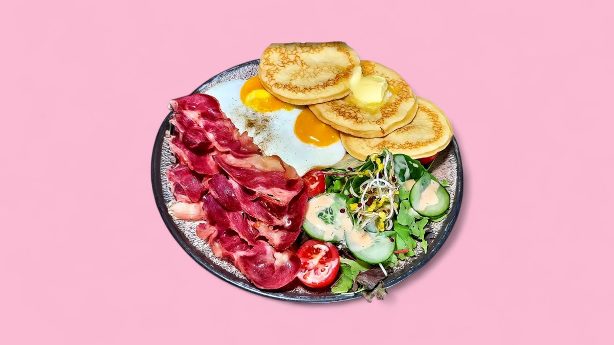 mit Halal 3 Rinderbacon , Spiegelei, 3 Pancake,Ahornsirup , Salat und Butter