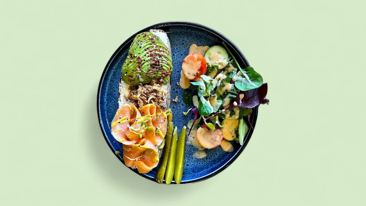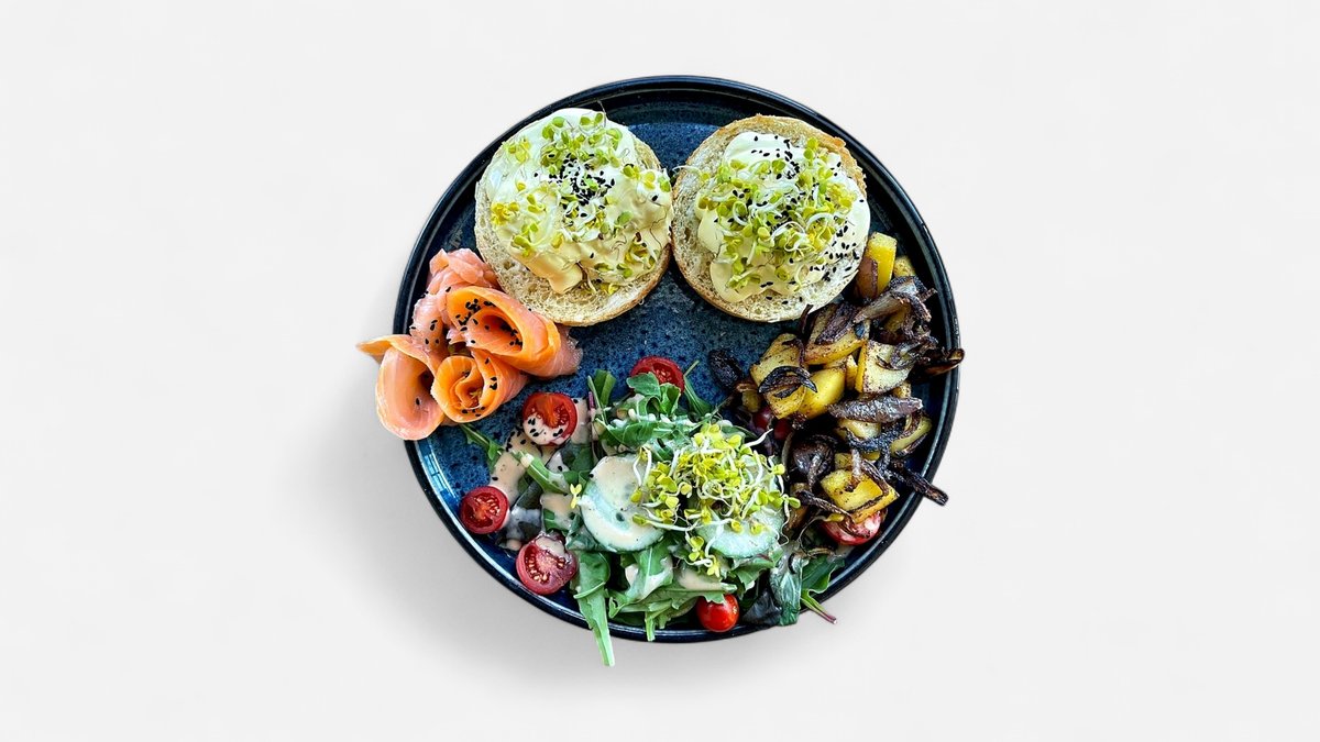 mit hausgemachtem Sauerteig Brot , Frischkäse, Räucherlachs, Avocado, Röstzwiebeln, Salat, saure Gurken, Honig Senf Soße,