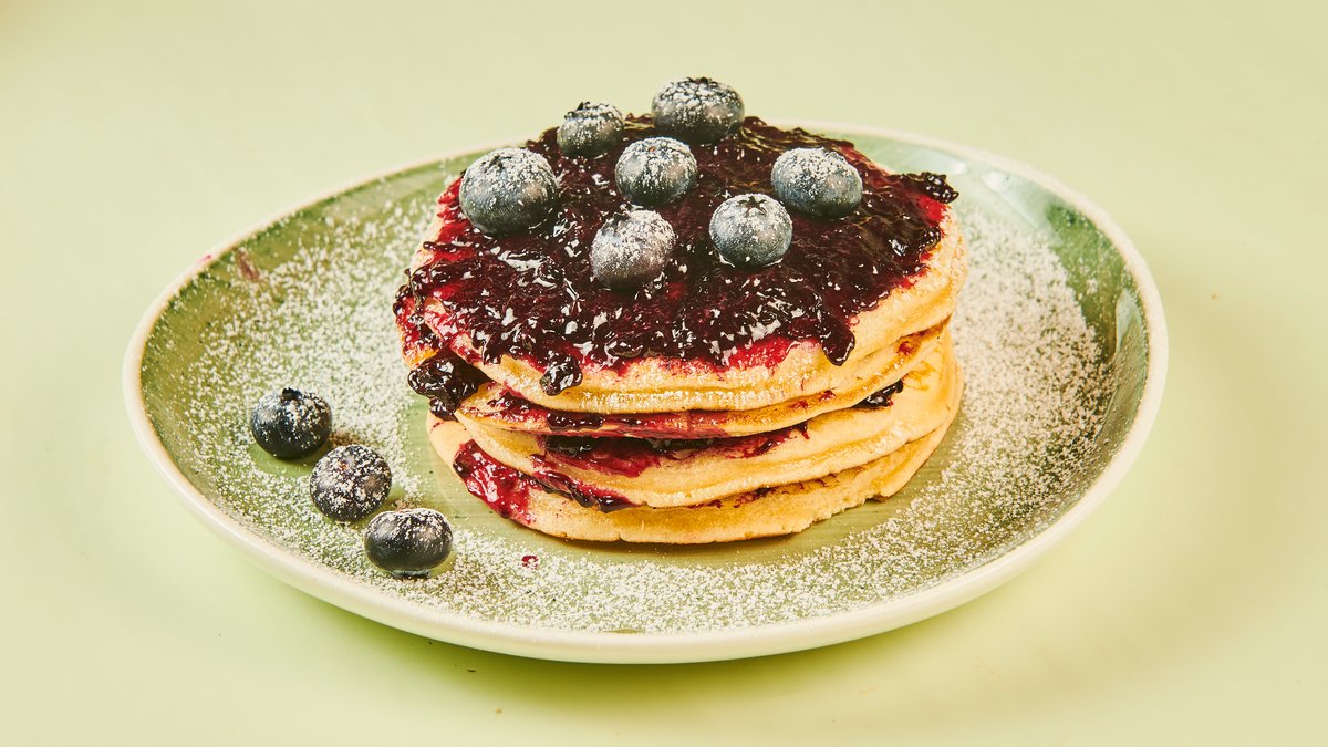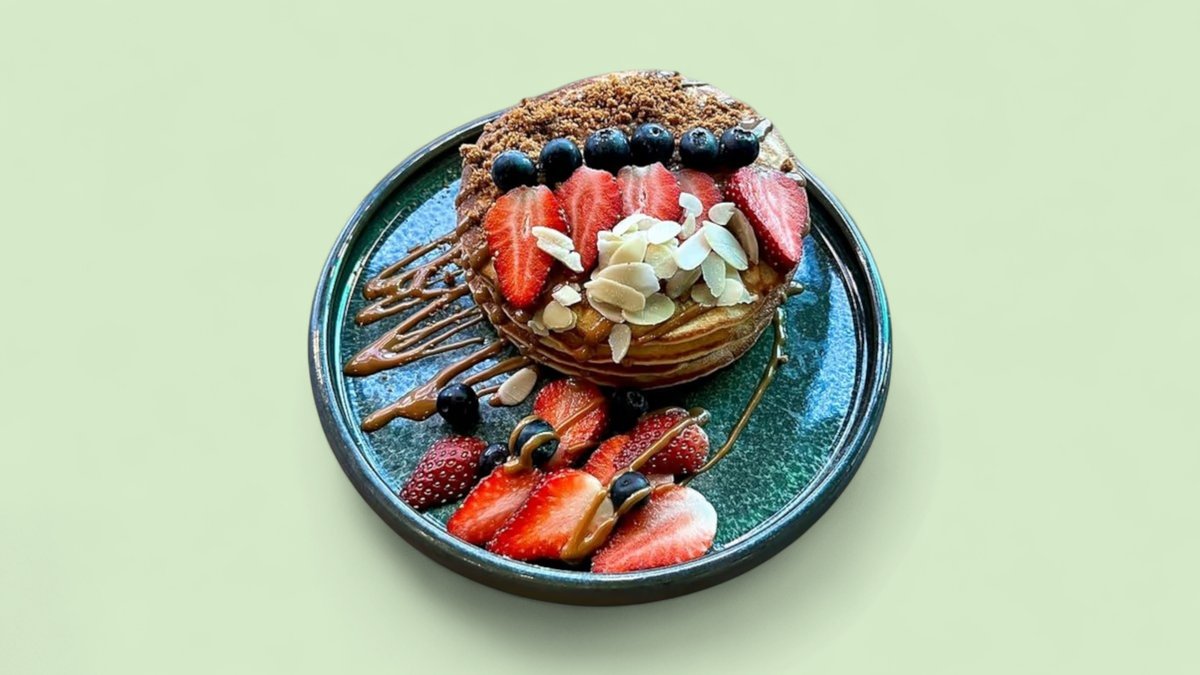 4 Pancakes,Lotus Biscoff Keks ,Blaubeeren,Erdbeeren, Lotus Biscoff Soße und Mandelraspeln