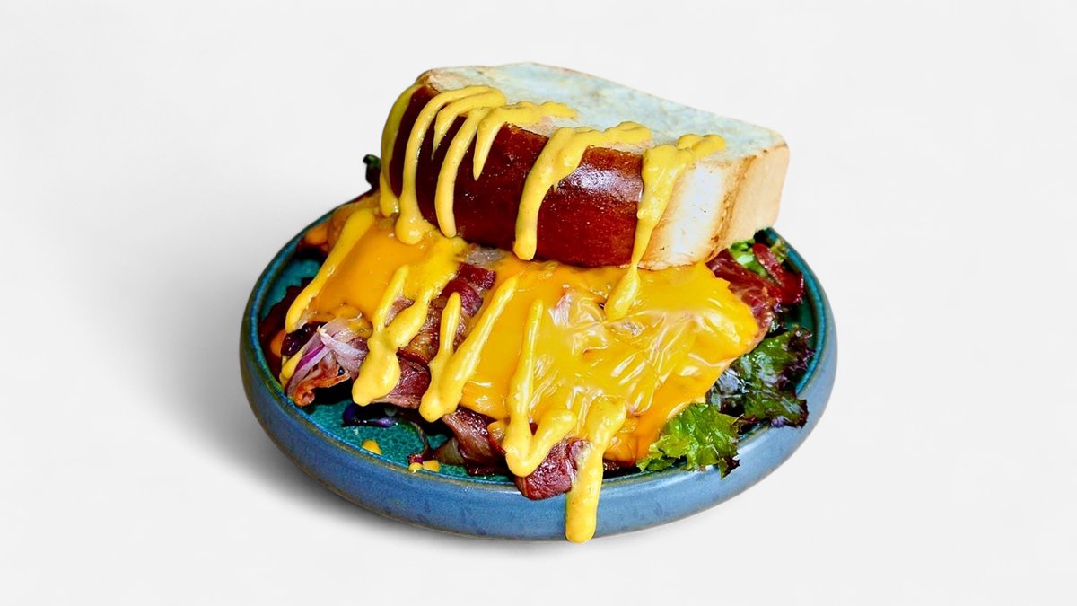 Brioche Brot, 3 Rinderbacon (halal), Chester Käse, Ei, Tomaten, Zwiebeln, Joppiesoße