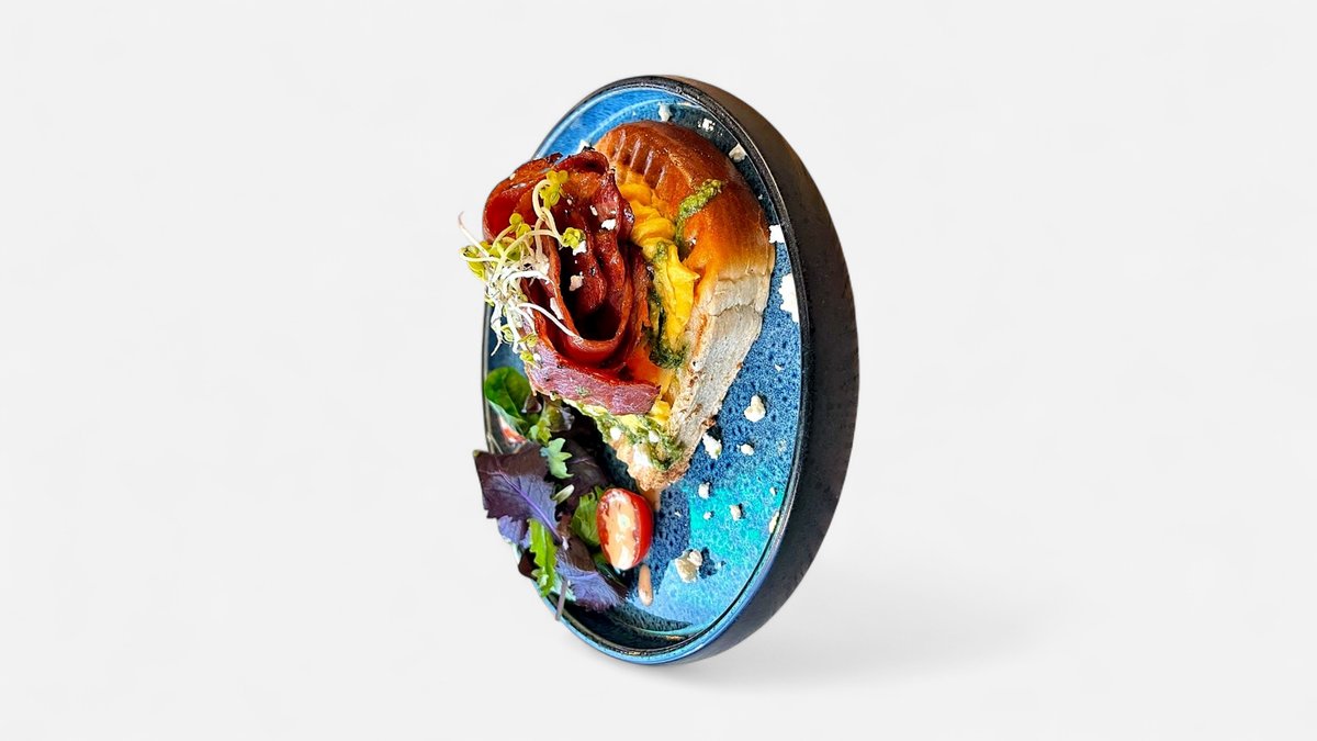 mit 3 Eiern (Höchste Qualität), 3 Rinderbaron, Briochetoast, Hummus, Salat und hausgemachter Pesto