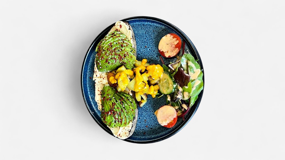 mit hausgemachtem Sauerteig Brot, Avocado, Hummus, Kartoffel mit Joppiesoße, Tomaten und Salat