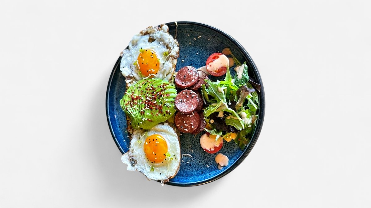 mit hausgemachter Sauerteig Brot, 2 Spiegeleiern, Avocado, Sucuk, Guacamole und Salat