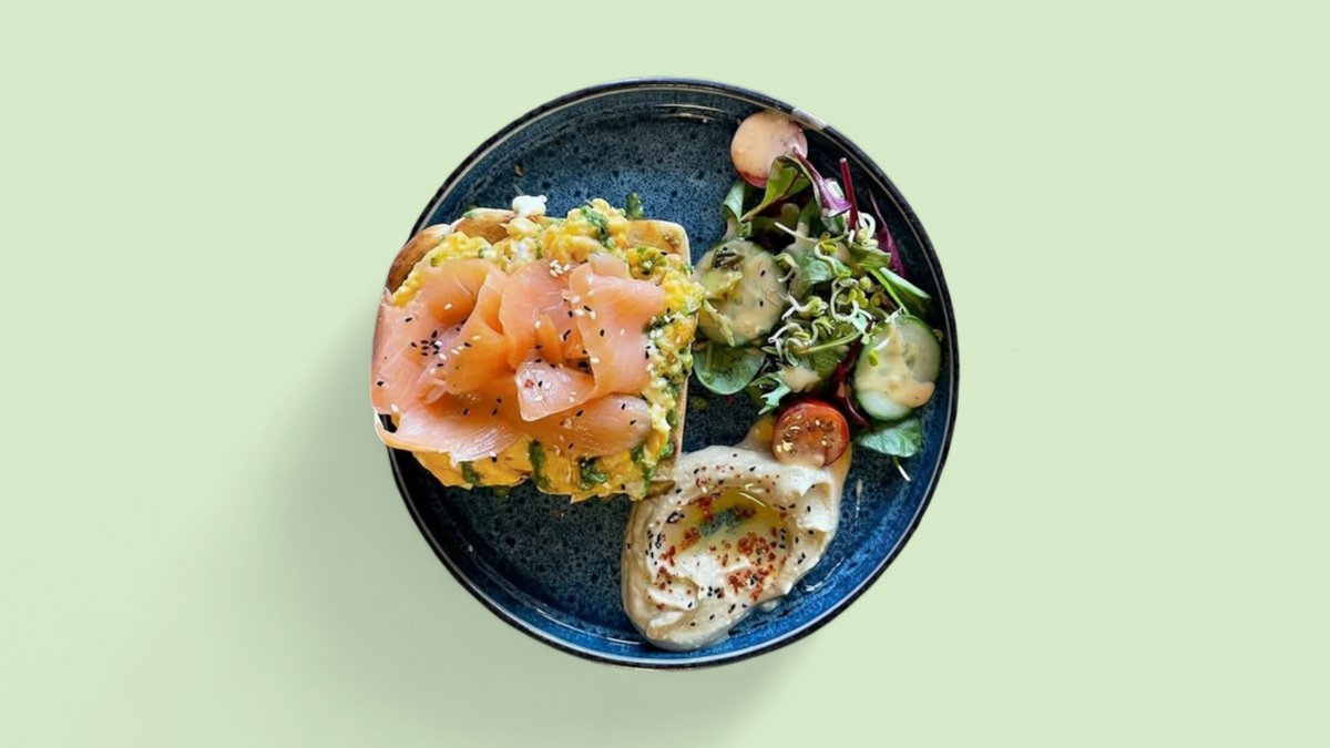 mit 3 Eiern (Höchste Qualität), Räucherlachs, Briochetoast, Hummus, Salat und hausgemachter Pesto