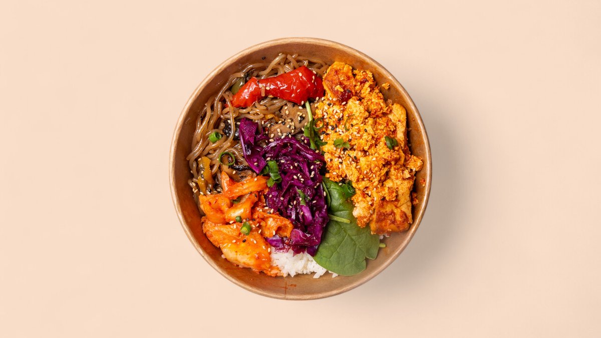Ein bunter Mix aus Salat, pikant mariniertem Tofu, Karotten, Tomaten Salsa, Gurken-Kimchee, Sojasprossen, Rotkohl-Kimchee, Frühlingszwiebeln, Sesam-Sojasoße und Spiegelei (bestimmen Sie selbst den Schärfegrad mit einer mitgelieferten, süßlich-scharfen Chilisoße)