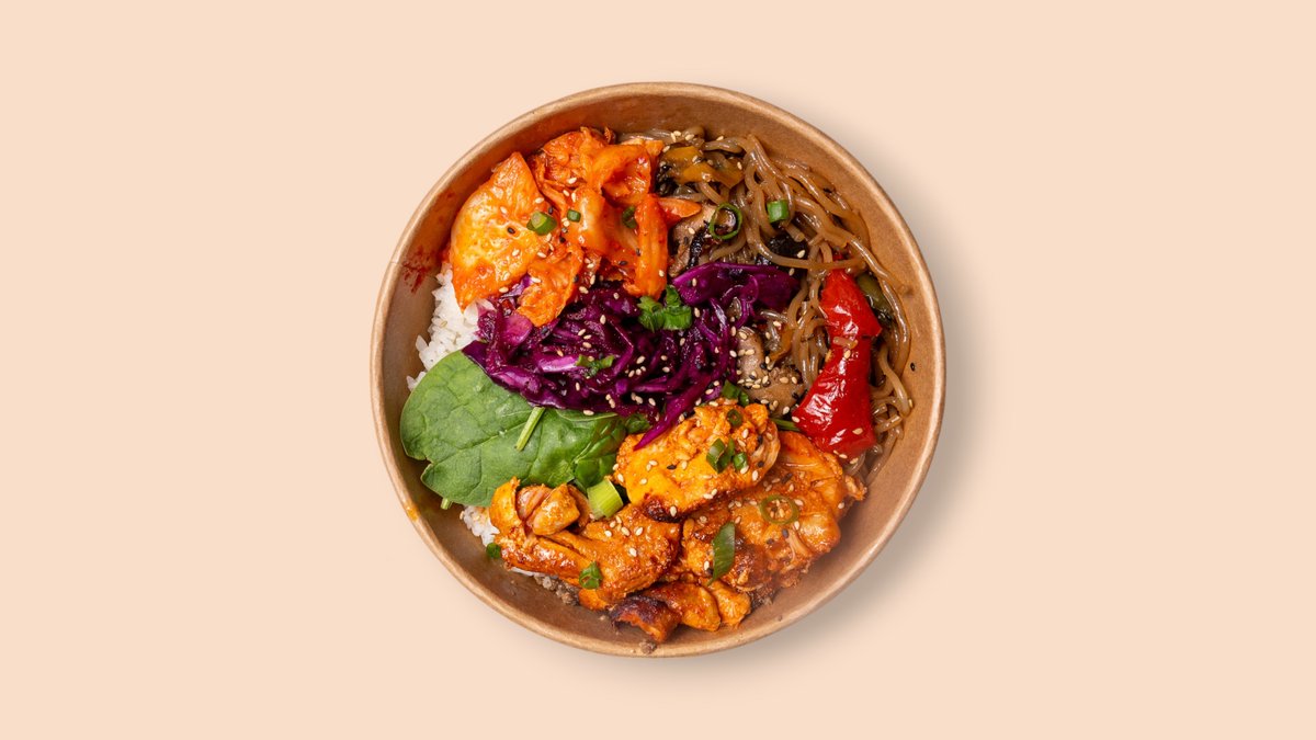 Eine klassische Süßkartoffel-Glasnudel Bowl mit koreanischen Reis, pikant marinierter Hühnerbrust, gegrilltem Paprika mix, Shiitake Pilze, Napa-Kimchee, Baby Spinat, Rotkohl-Kimchee, Sesam-Sojasauce, Frühlingszwiebeln und Sesam