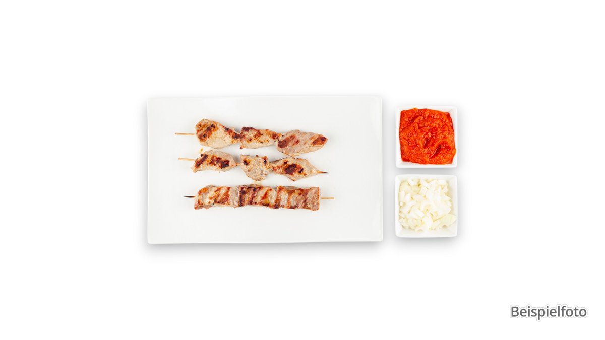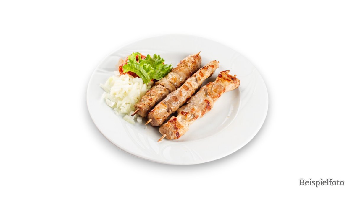 1x gegrillter Spieß mit Hähnchen, Schwein, Lamm, Tsatsiki-Dip und Salat