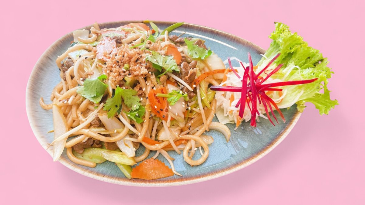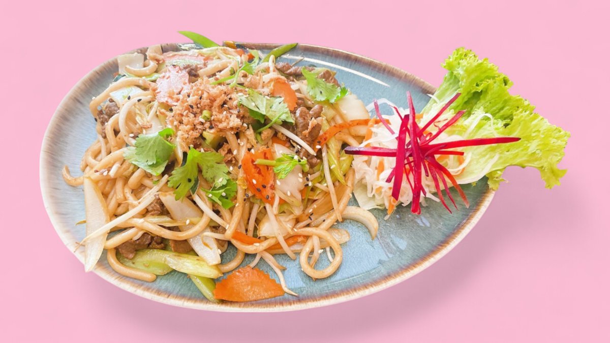 fried Vietnamese glass noodles with soybean sprouts, leek, carrots, Chinese cabbage, fried onions, coriander and fried beef