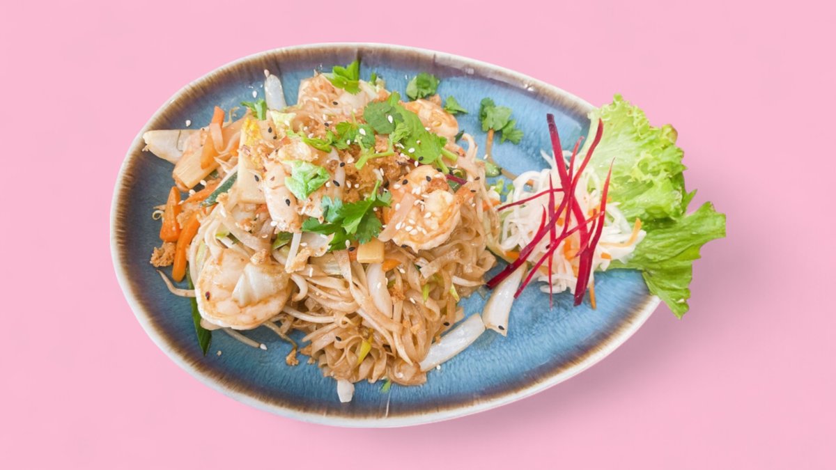 warm rice noodle salad, refined with bean sprouts, lemongrass, fresh herbs, coriander, roasted onions and peanuts in a wonderfully fresh lime-chilli-fish sauce, served with prawns