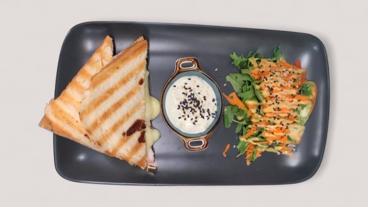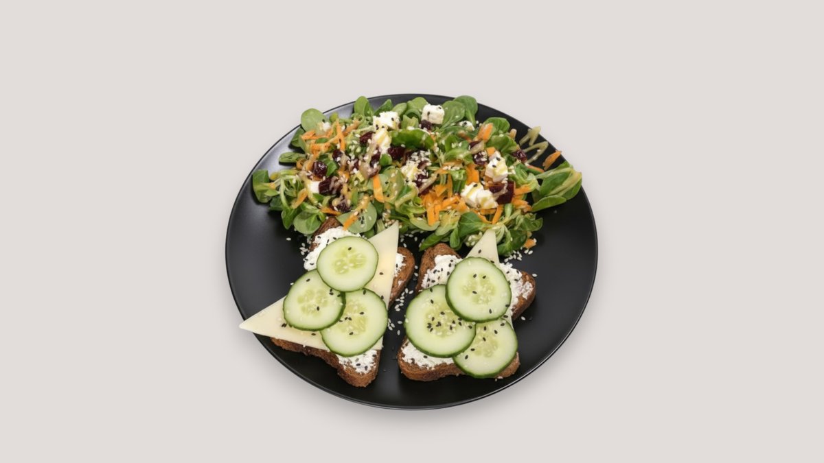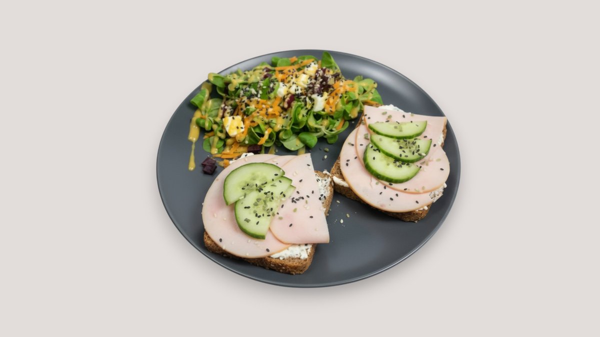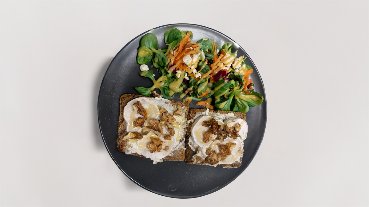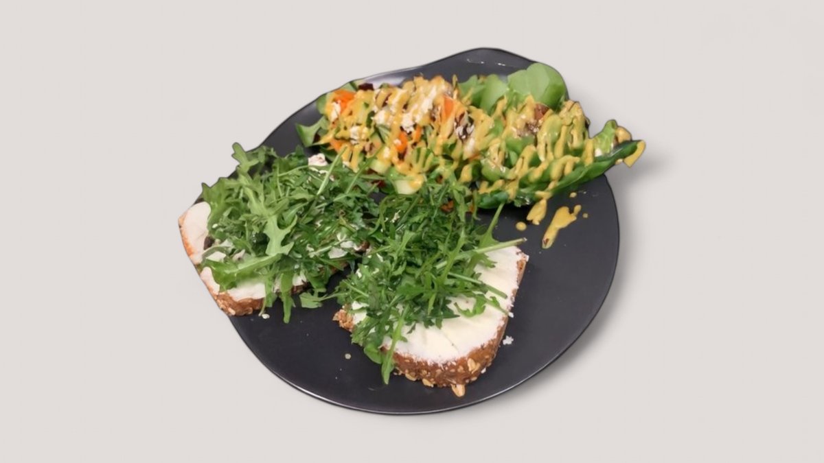 served with a slice of bread. The base consists of lamb's lettuce, cucumber, carrot & beetroot - choose from: honey mustard or tahini dressing