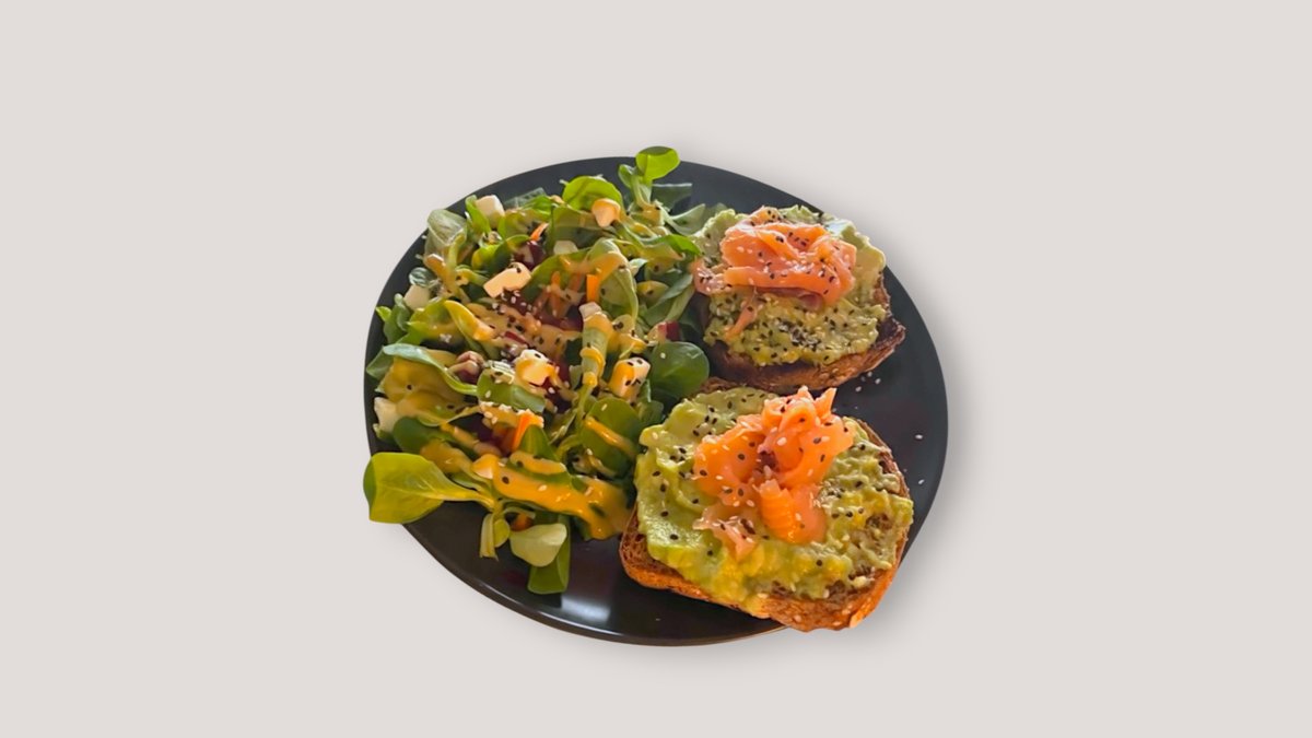 Salad with Smoked Salmon, Avocado and Almond Leaves