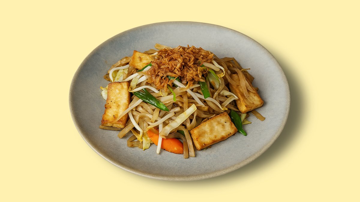 fried flat rice noodles with soybean sprouts, fresh vegetables and an ingredient of your choice