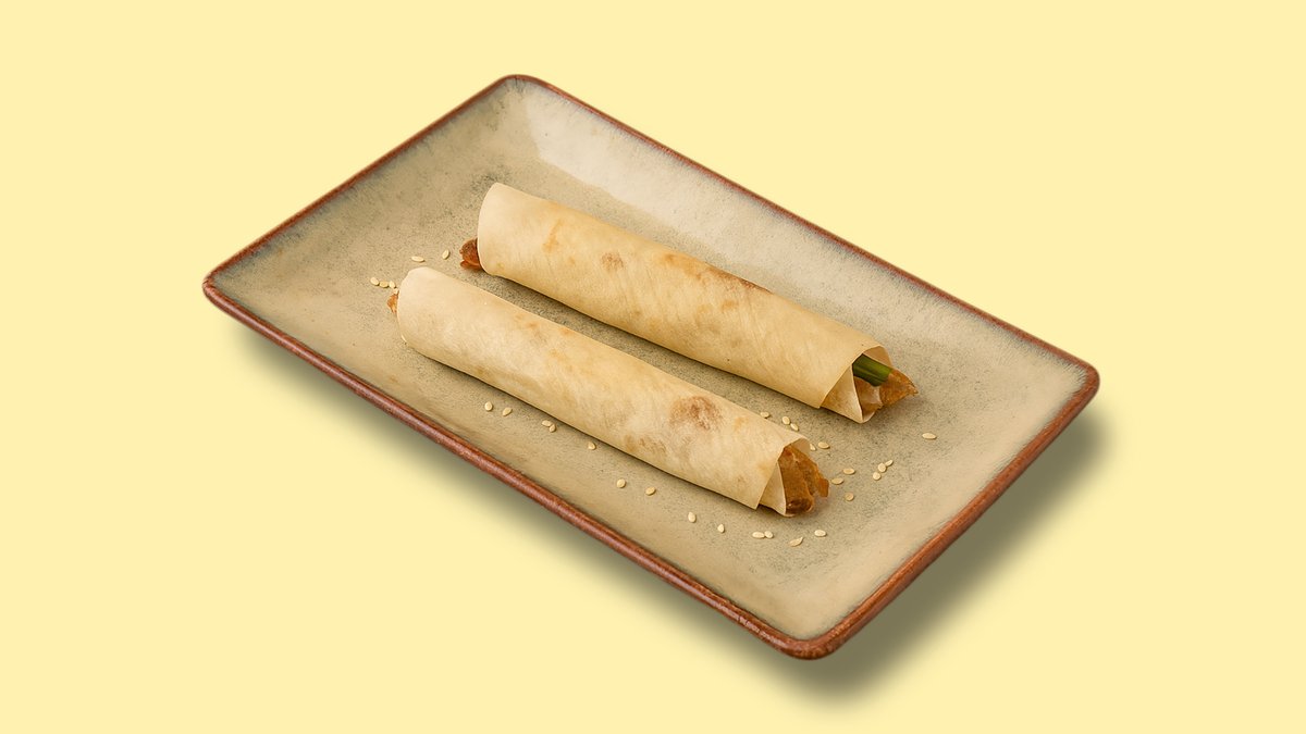 2 pieces Chinese pancakes with roasted vegan duck, cucumbers, hoisin sauce and spring onions