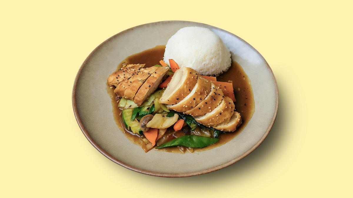 with crispy vegan duck, fresh vegetables sautéed in the wok, snow peas, garlic, ginger and rice