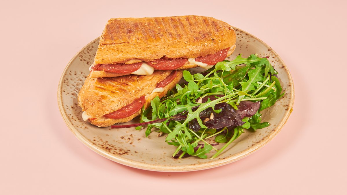 mit Mozzarella, Gouda, getrocknete Tomaten, Basilikum Pesto und hausgemachter Tomatencreme