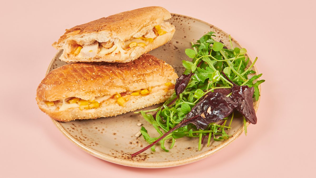 mit Hähnchenbrust, Gouda, Mais, hausgemachter Tomatencreme und Süß-Sauer-Soße