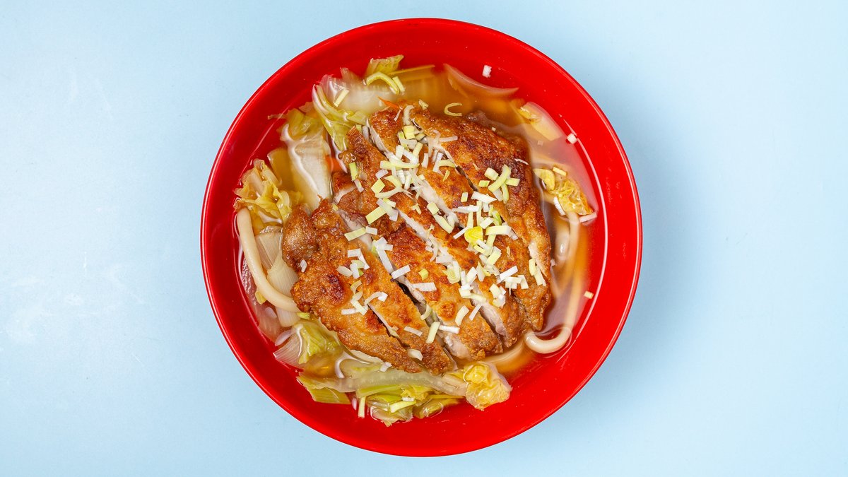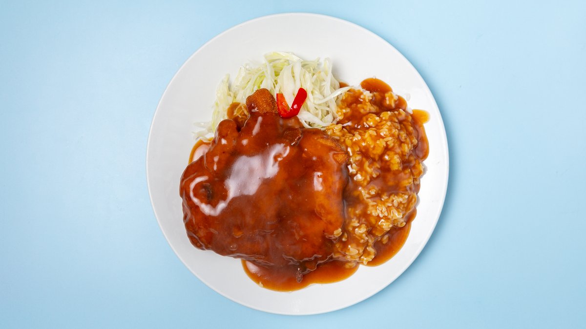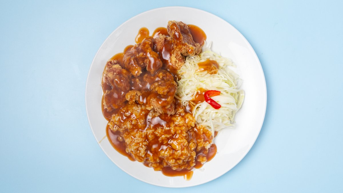 with breaded chicken, onions, egg and sweet soy sauce