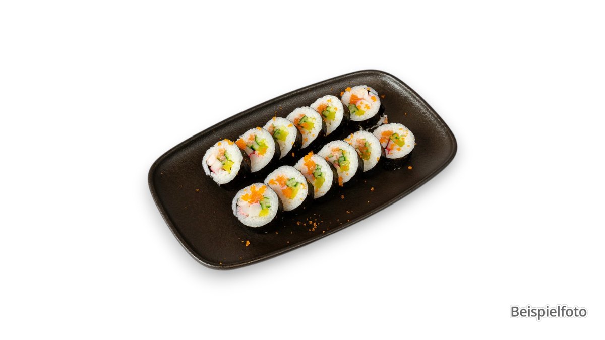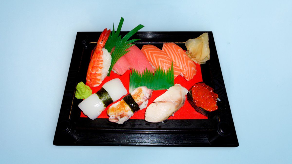 with salmon and tuna fillets, salmon caviar, sushi rice, 3x California maki, 3x kappa maki, deep-sea prawns and tamago, served with green horseradish, ginger and soy sauce