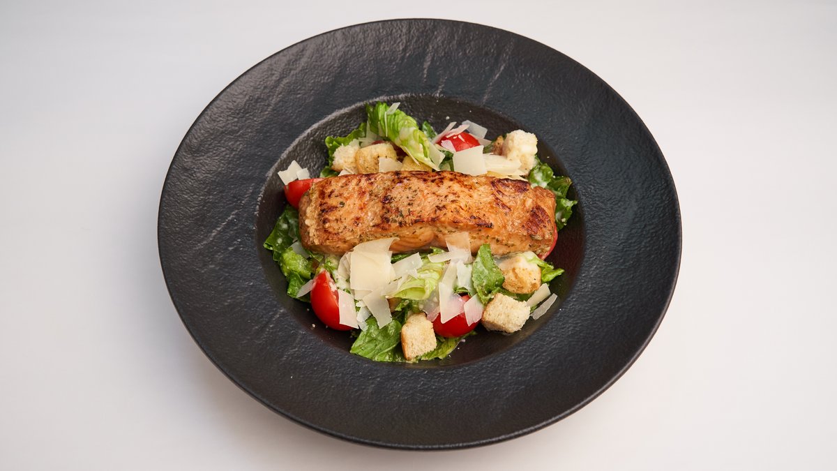 Römersalat mit gegrilltem Lachs, Kirschtomaten, Croutons, serviert mit Caesar-Dressing und Parmesankäse