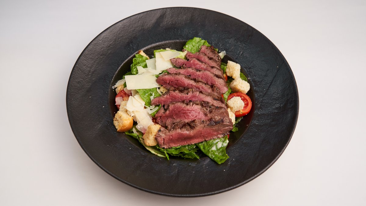 Römersalat mit Rinderfiletspitzen, Kirschtomaten, Croutons serviert mit Caesar-Dressing und Parmesankäse