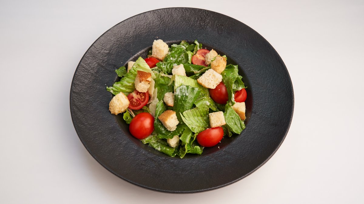 Römersalat mit Kirschtomaten, Croutons, serviert mit Caesar-Dressing und Parmesankäse