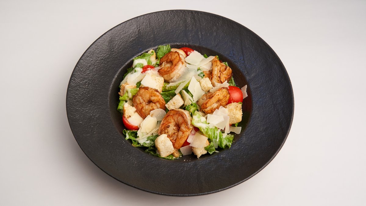 Römersalat mit Gambas, Kirschtomaten, Croutons, serviert mit Caesar-Dressing und Parmesankäse