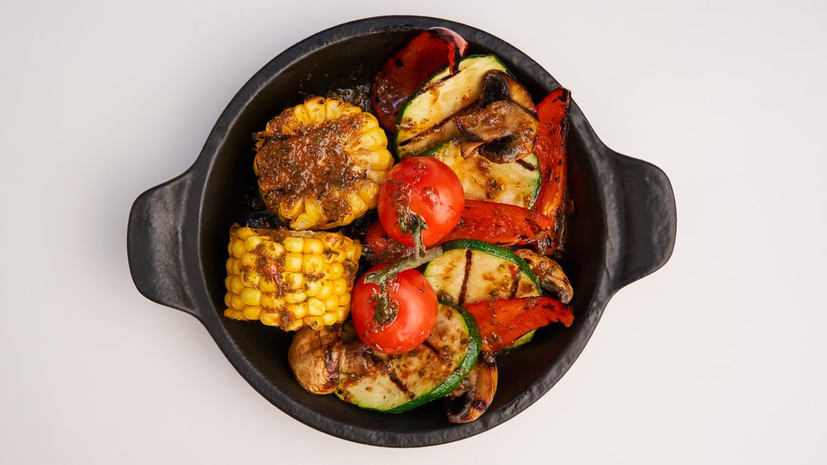 mit pflanzenbasiertes Patty aus Erbsenprotein, gegrillte Paprika, Zucchini, gemischter Salat, Tomaten, rote Zwiebeln und hausgemachte Barbecuesoße