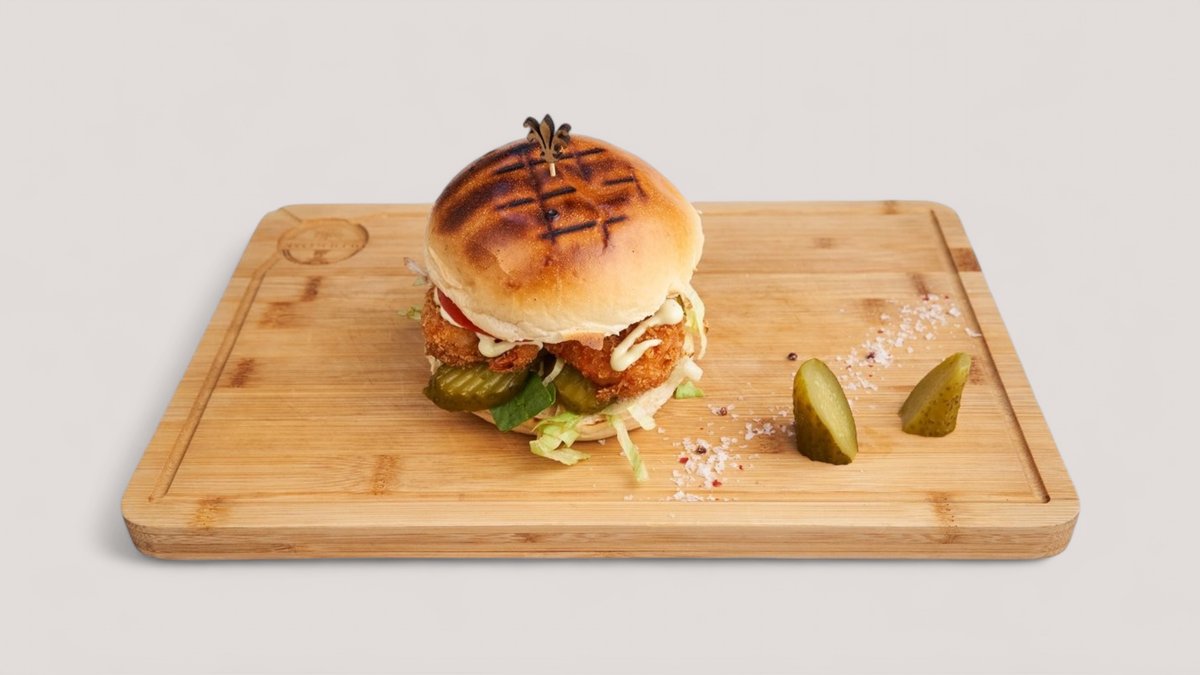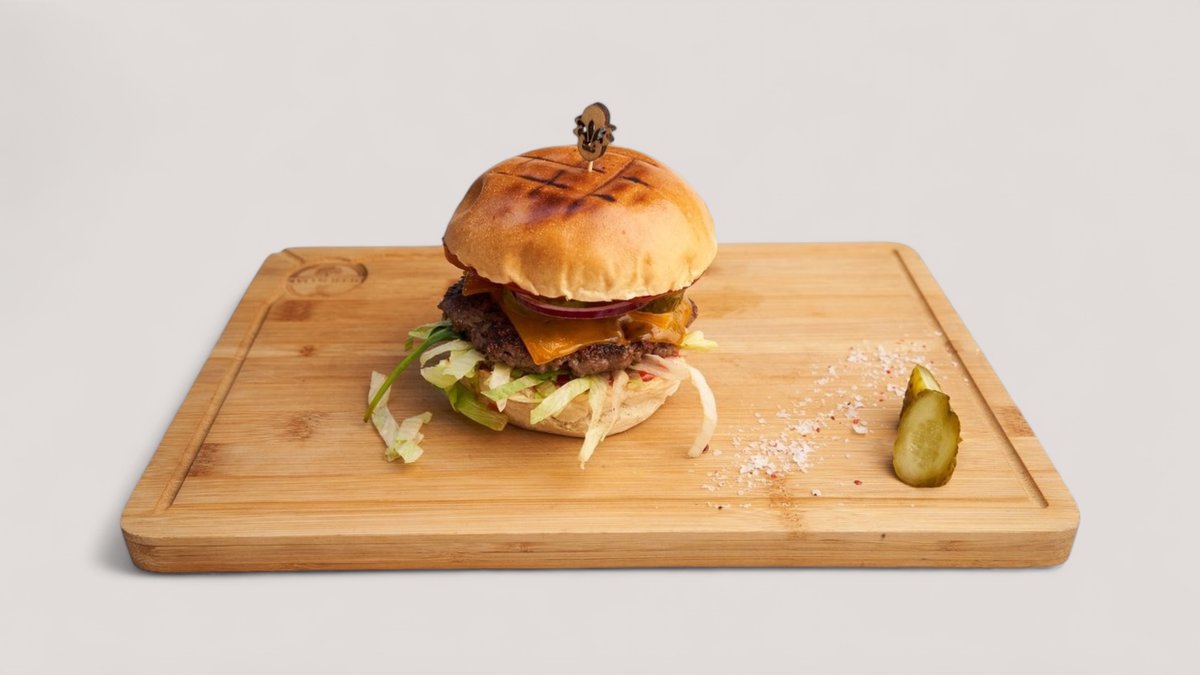 180 g mit Premium Rindfleisch, Cheddar Käse, gemischter Salat, Tomaten, eingelegte Gurken, rote Zwiebeln und hausgemachter Ketchup und Senf