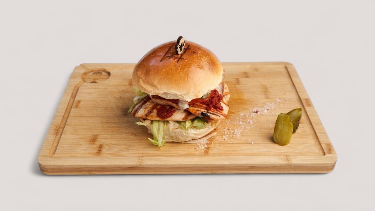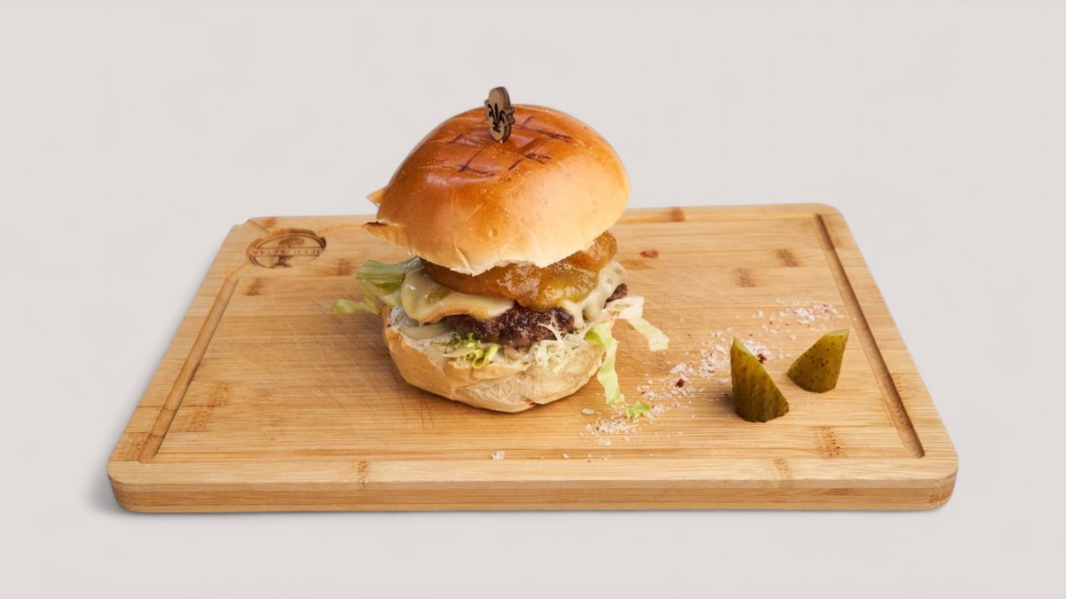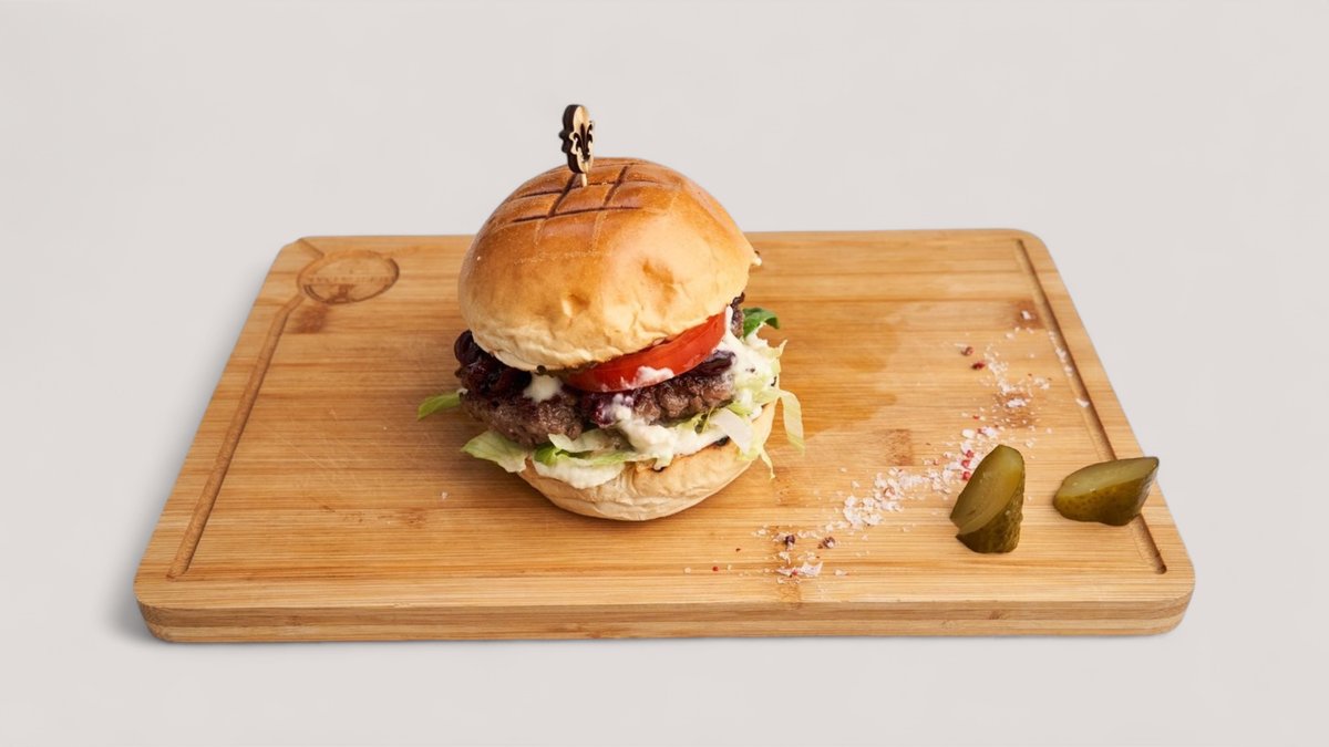 180 g mit Premium Rindfleisch, Cheddar Käse, gemischter Salat, Tomaten, eingelegte Gurken, karamellisierte Zwiebeln, hausgemachte Barbecuesoße und Bacon vom Lavasteingrill
