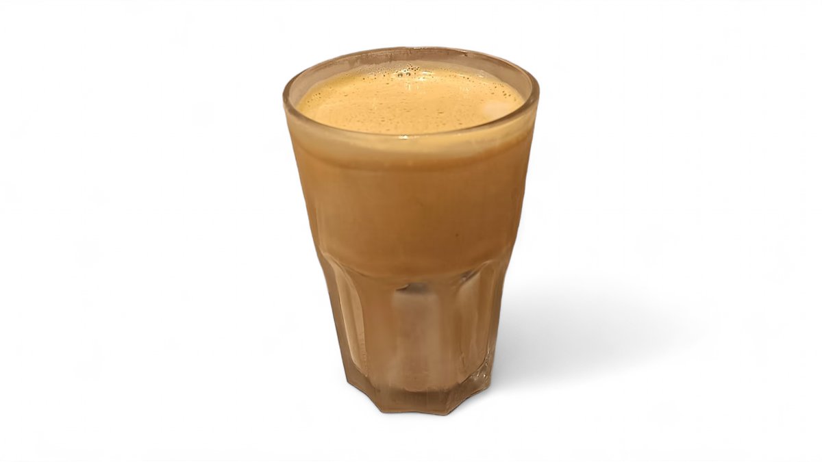Ein gewürzter Schwarztee (Chai) mit Milch, auf Eis serviert, mit einem süßen und würzigen Geschmack.