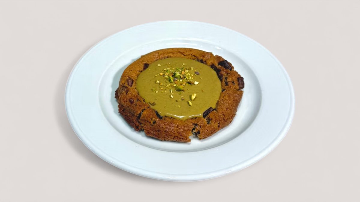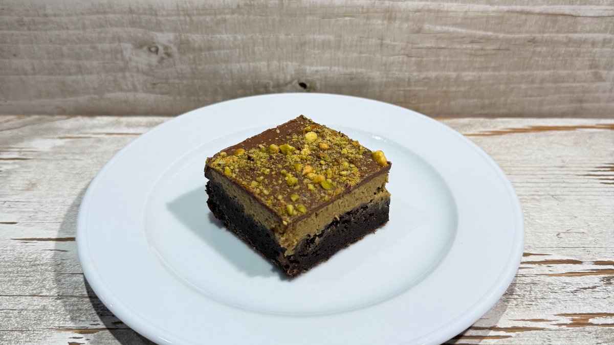 Rich chocolate brownie with milk chocolate chunks, filled with homemade Dubai pistachio cream and topped with crunchy pistachios.
