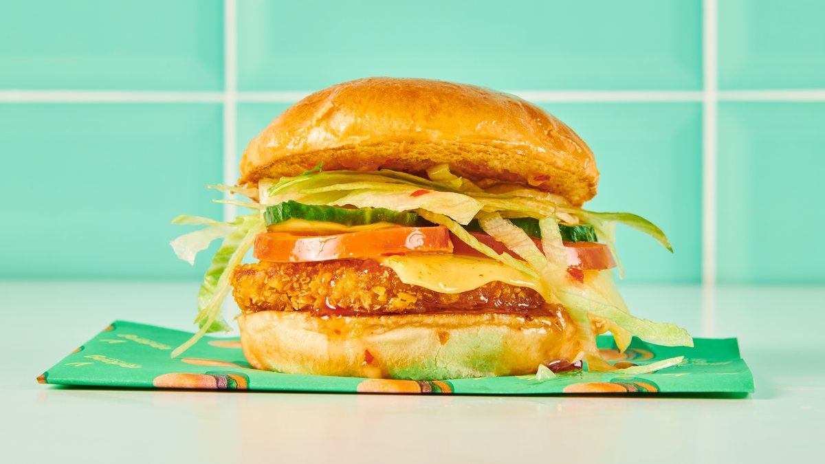 mit Crispy-Chick-Patty, Vedang-Mayonnaise, Salat, roten Zwiebeln, Tomaten und Salatgurken
