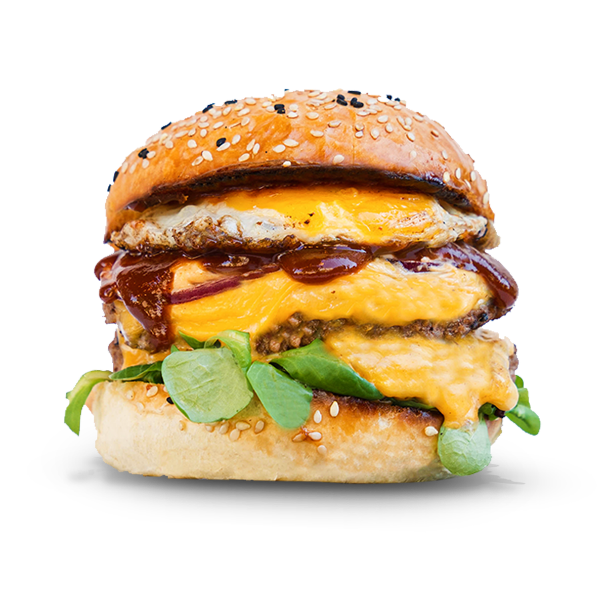 mit 160 g Black Angus Beef, Salat, geschmolzenem Cheddar, Beef-Bacon, Spiegelel, Gewürzgurken, roten Zwiebeln & Barbecuesoße