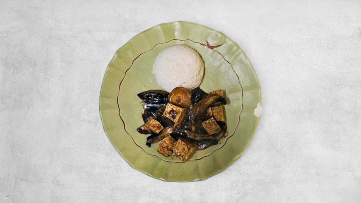 baked tofu with giant mushrooms and shiitake in caramelized soy-sesame sauce and fragrant rice