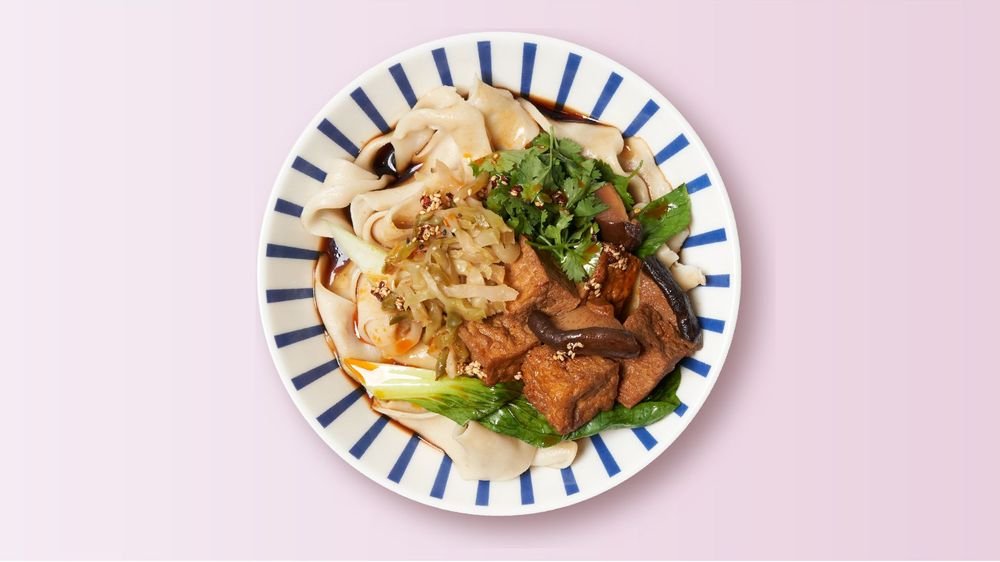 mit Tofu, Shiitakes, Wencheng-Soße, Tomaten-Knoblauch-Soße, asiatischen Pickles, Chili-Öl und Koriander