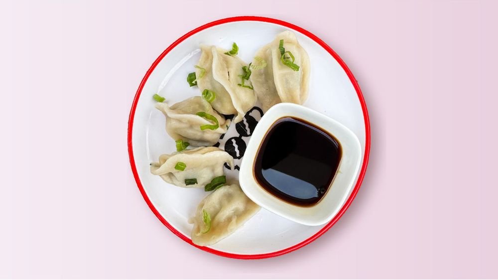 Gekochte Schweinefleisch- und Schnittlauch-Dumplings, serviert mit unserer hausgemachten Sojasoße