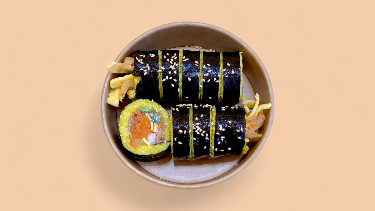 Kimchi Gimbap ist eine gerollte Reisrolle mit Seetang, die mit Kimchi und weiteren Zutaten wie Ei und gemüse gefüllt wird. Sie kombiniert die pikante Säure von fermentiertem Kimchi mit dem milden Geschmack von Reis und aromatischem Sesamöl.