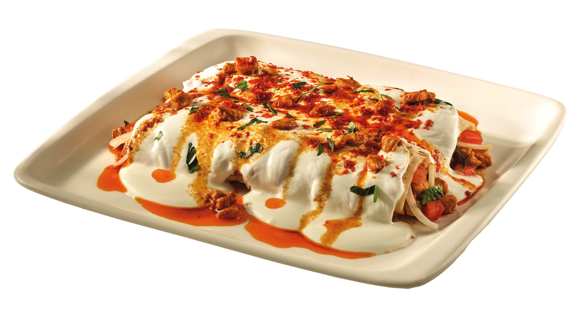 mit Hähnchenbrust, Zwiebeln, Tomaten, Petersilie, Pommes frites, Peperoni und Spezialsoße