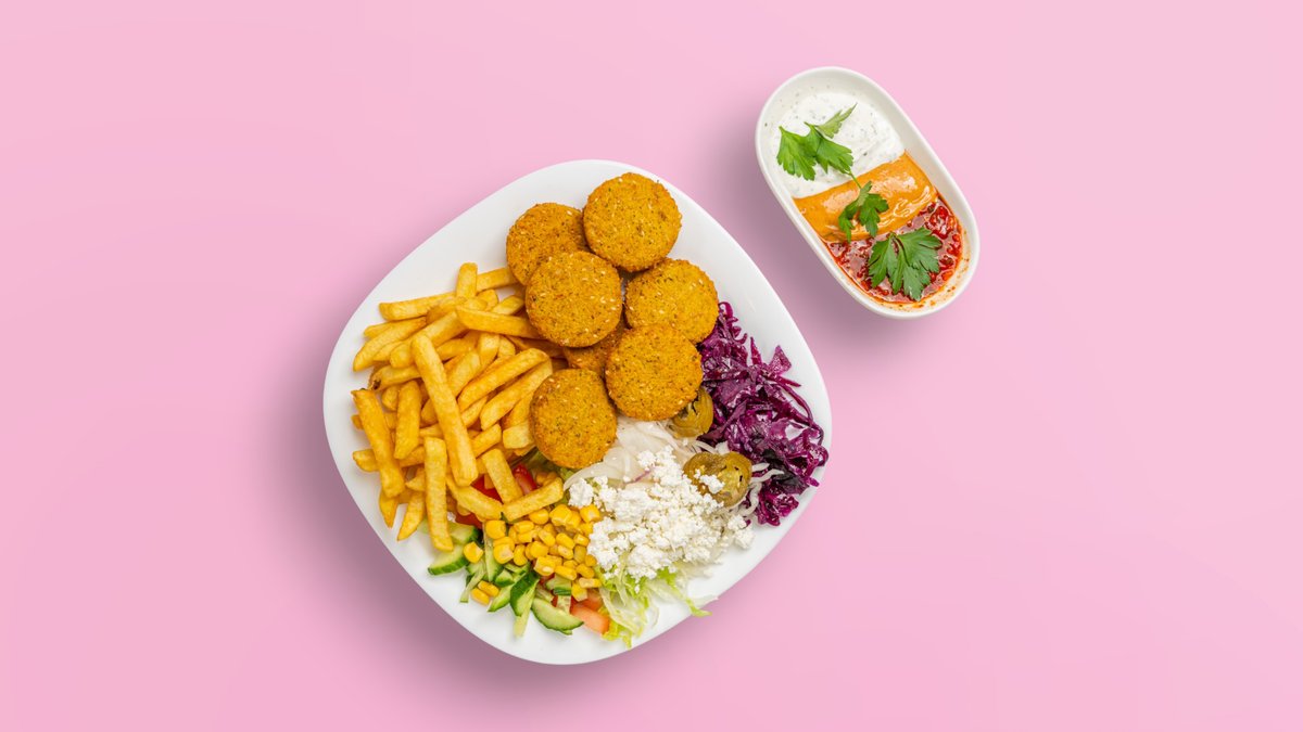 with your choice of meat of your choise, salad, sauce and French fries in your choice of size