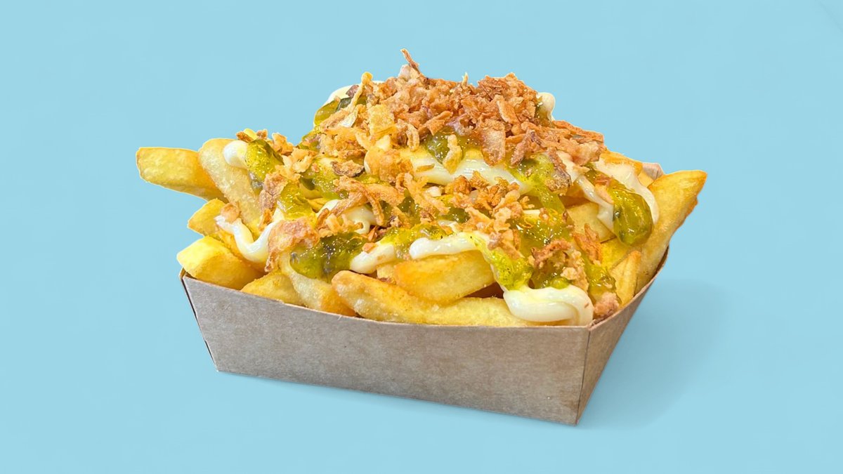 with French fries, mayonnaise, cucumbers relish and fried onions